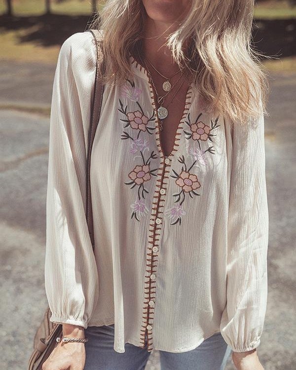 Simpluxe Retro Embroidered V-Neck Blouse – Loose Fit Floral Top
