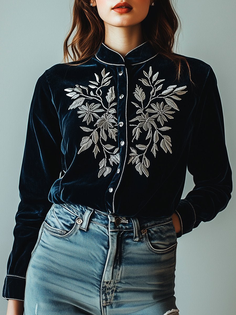 Simpluxe Velvet Shirt – Silver Leaf Embroidered Single-Breasted Design